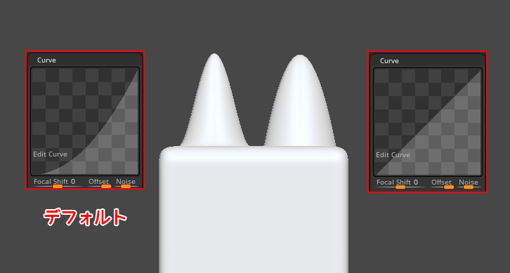 曲率を持つサーフェスにこのブラシを適用する場合、ブラシの影響範囲にどれだけ多くの頂点があるかでブラシの反応が異なります。