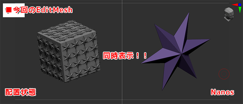 以前のNanoMeshはEditMeshに入るとNanoMesh(Nanos)単体で表示され、EditMeshから出るまでどのように配置に影響するかがわからない状態でした。