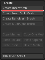 - そのまま新しいインサートメッシュの状態でBrush>Create>Create Nanomesh Brushを押します。