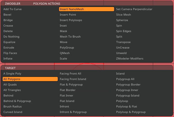 - サブツールリスト2つ目のNano TilePlaneサブツールを選択した状態で、ZModeler ポリゴンアクションでInsert Nano Meshを選択、ターゲットをAll Polygons でナノメッシュを適用します。