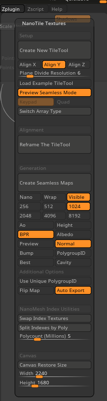 - Zplugin>NanoTile Textures>Creates a new Tile Tool ボタンを押してTile Toolファイルを作成します