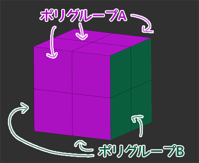 正面からドラッグした範囲のポリゴンのみ表示、ポリグループを統一します。