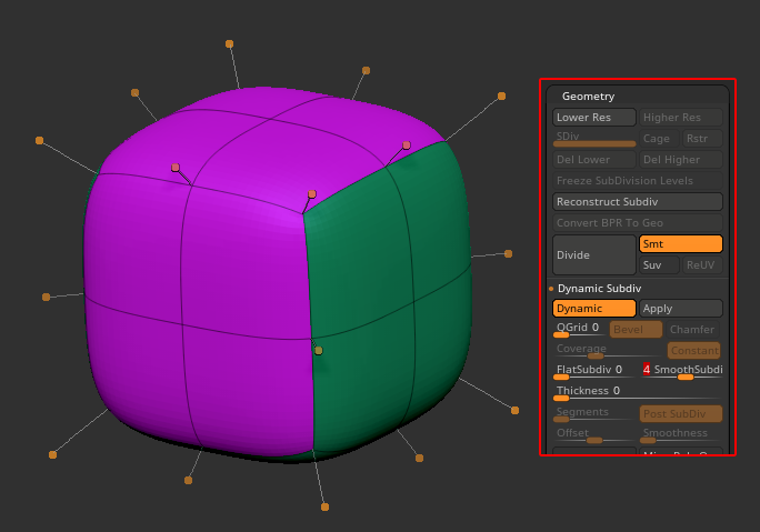 - Tool>Geometry>Dynamic Subdivisionを使用し、SmoothSubdivを4にして滑らかにします