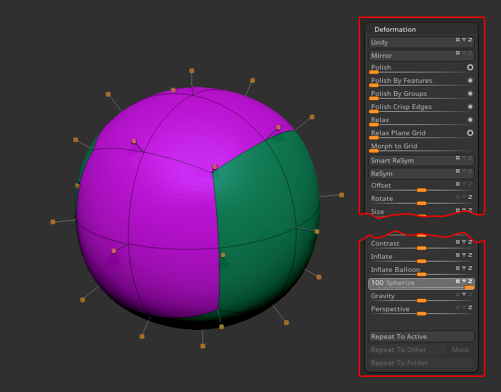 - Tool>Deformation>Spherizeを100に。複数回適用することで球体になります。