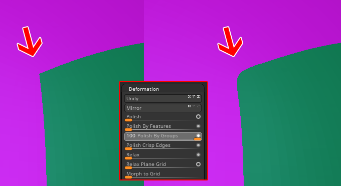 - Tool>Deformation>Polish By Groupsを100に。複数回適用すると若干角が取れます