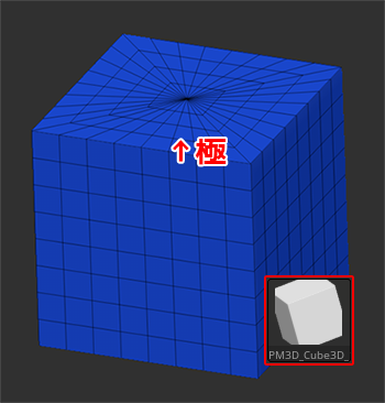 極の無いCubeから始めます。Cube3Dは極があるモデルなので、PolyMesh3Dに変換してから