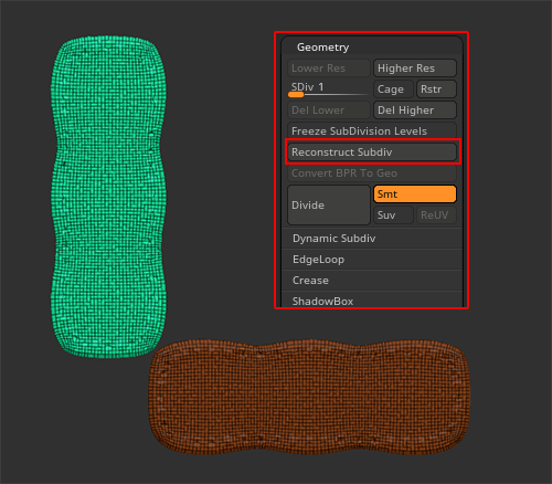 - この球体を複製、元を非表示にして、複製した球体のSDivを6に戻した状態でTool>Geometry>Del lowerで下位のSubdivを削除します。