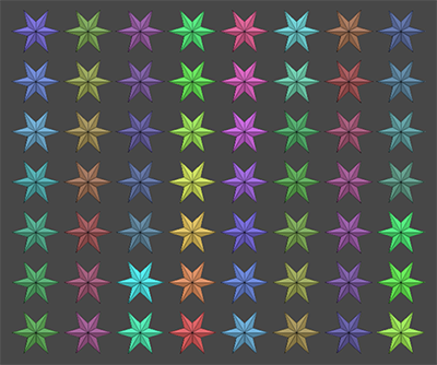 Tool>Polygroups>ReGroupVisibleで変更することなどがリプされていますが、根本的な配色にランダムさを加えるようなことは出来ないようです。要望としてMaxon(Pixologic?)にあげると良いかもしれませんね