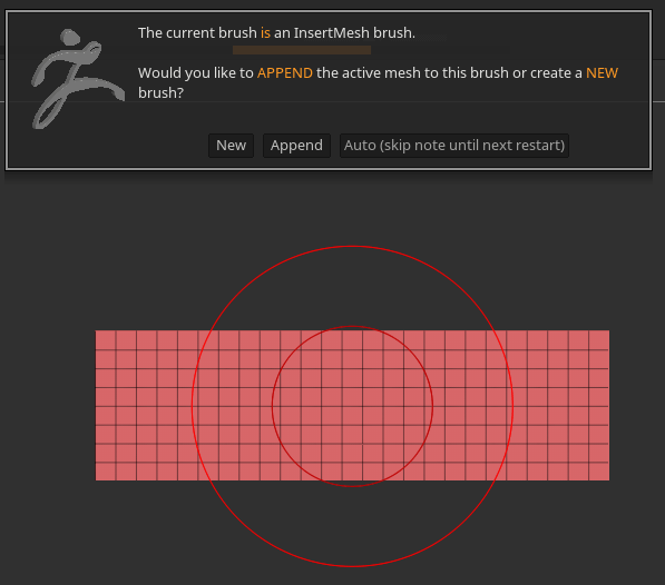 選択中のメッシュを現在のブラシに追加するか(Append)、新規でブラシを作成するか(NEW)聞かれますのでここはNEWにしておきましょう。選択中のブラシに追加したい場合はAppend。