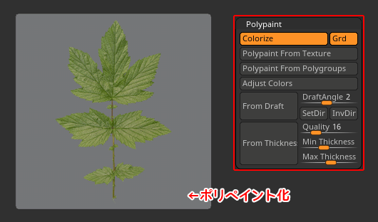- Tool>Polypaint>Polypaint From Textureでテクスチャをポリペイントに変換します。
