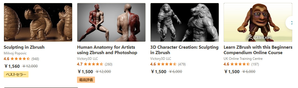 Adobe関連(AfterEffects、Photoshop、illustrator等)や最近流行のBlender、もちろんZBrush日本語コースもあります。