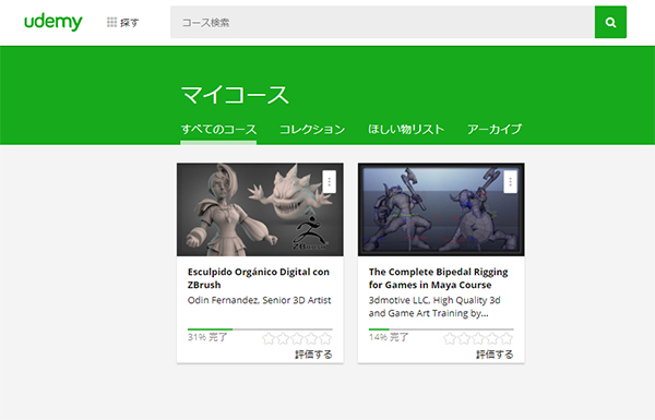 オンライン学習プラットフォームの一つで、CG関連はもちろんのことプログラミングやらWebデザインなどなど様々なコースが用意されています。