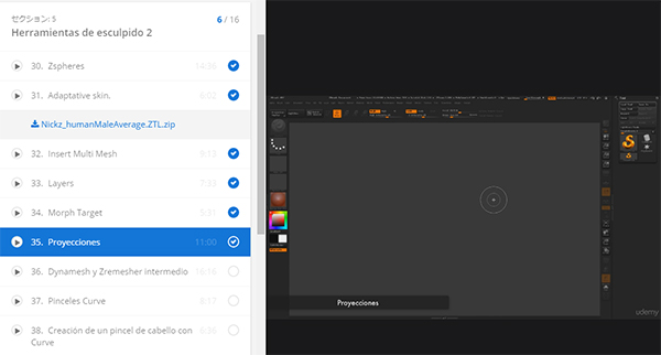 Esculpido Orgánico Digital con ZBrushのセクション1~5のコース46まで。