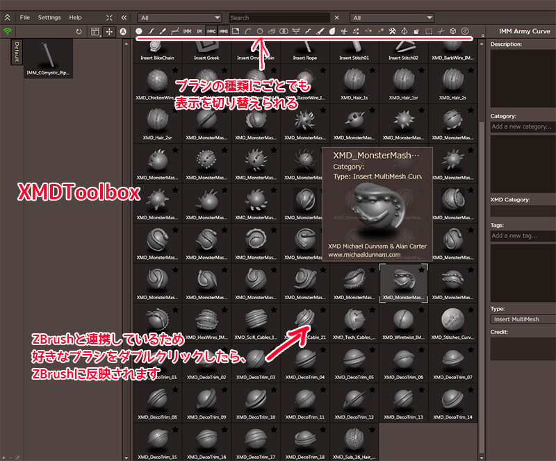 ZBrushのブラシ管理ツール XMDToolbox を有料配信(2018年4月現在48$)しています。