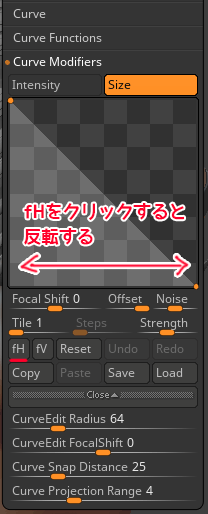 そんなときにはStroke>Curve Modifires >Curve FalloffをひらきfH(Filip Horizontally)をクリックしてグラフを反転させます。