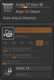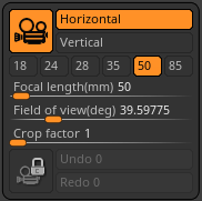 焦点距離スライダーのすぐ上にあるこれらのプリセットは、最も人気のあるレンズの値を素早く設定することができます。これらのボタンのいずれかをクリックすると、焦点距離スライダーの設定が連動して変更されます。