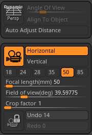 Horizontal (水平)またはVertical (垂直)モードは、カメラセンサー/フィルムの水平または垂直サイズを使用して、カメラの計算をどのように行うかを定義します。