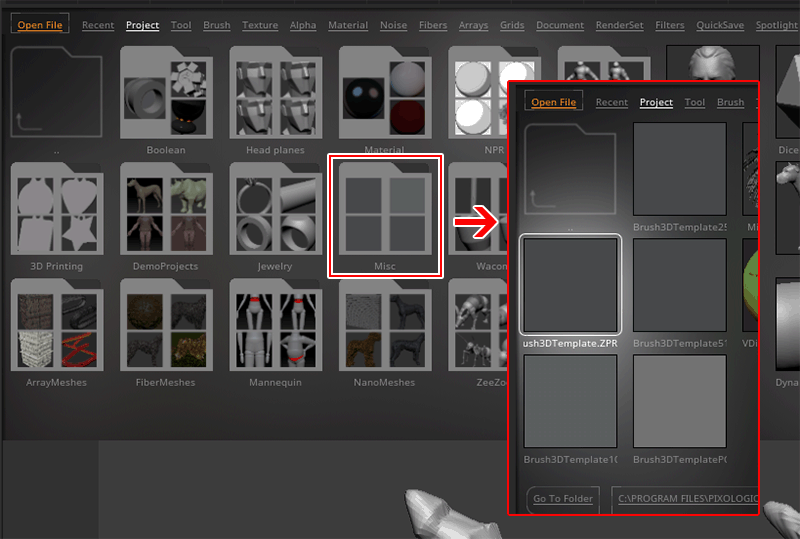 - LightBox >Project > Miscフォルダにある Brush3DTemplateのどれかを選びます