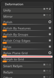 グリッド構造を維持する必要があるため、スライスカーブやDynaMeshのようなトポロジーを変更してしまう機能は使えません。サブディビジョンサーフェスの使用は可能です。もし、メッシュの極端な伸びが気になる場合は、Tool > Deformation> Relax Plane Gridを使ってトポロジーをリラックスさせることが出来ます。