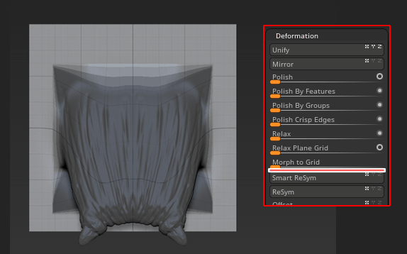 Relax Plane Gridは、どうしてもディテールを甘くしてしまうためVDMのラフなシルエットを構築する段階で使用することをお勧すすめします - グリッドの境界が正方形であることを確認してください。そうでない場合は、境界線以外のすべてをマスクしてから、Tool> Deformation>Morph to Gridを100%で使用し、正方形化してください