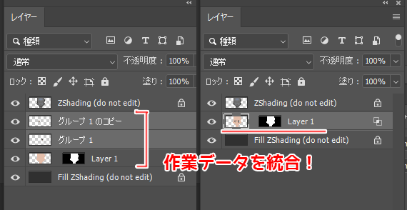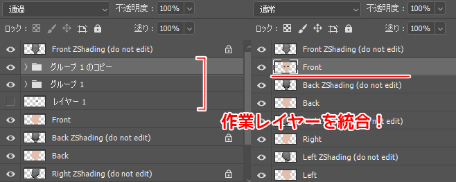 編集可能レイヤの上下にある鍵マークのついているレイヤーは触りません - 必ず最後にはレイヤーの統合を