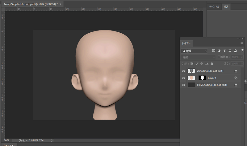 送信されたPSDデータはTempZAppLinkExport.psdという名前がついています。この名前と保存場所(C:\Users\Public\Documents\ZBrushData2021\ZPluginData\ZAppLinkData)を変更することなく、上書き保存してください。