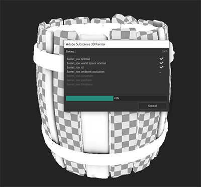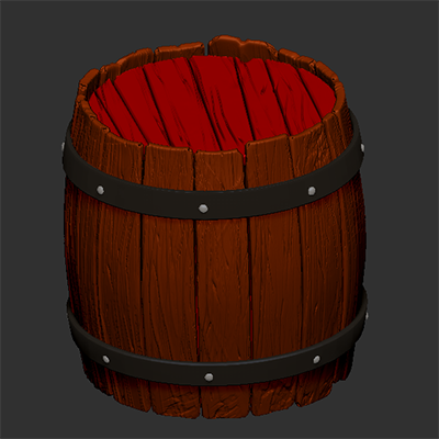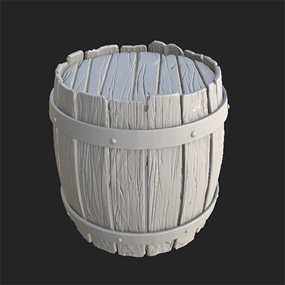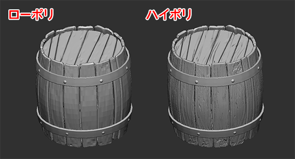 今回用意したのは以前作った樽。ハイポリゴンのモデルとローポリゴンのモデルを用意しました。