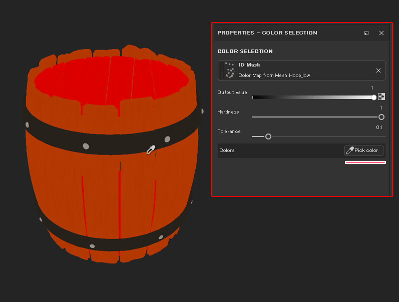 - Add Mask with Color Selectionが選択された状態で、Properties>Color Selection> Pick Colorボタンを押します。モデルの色がZbrushで設定した色に変わります。ここから好きな色をクリックすると、それに応じてマスクされます。