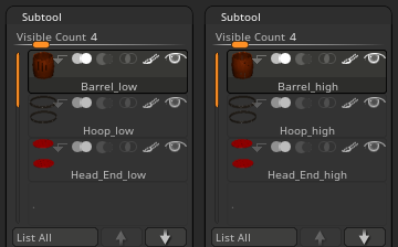 ローポリ、ハイポリ各SubToolのそれぞれ末尾に「_low」「_high」と名前をつけます