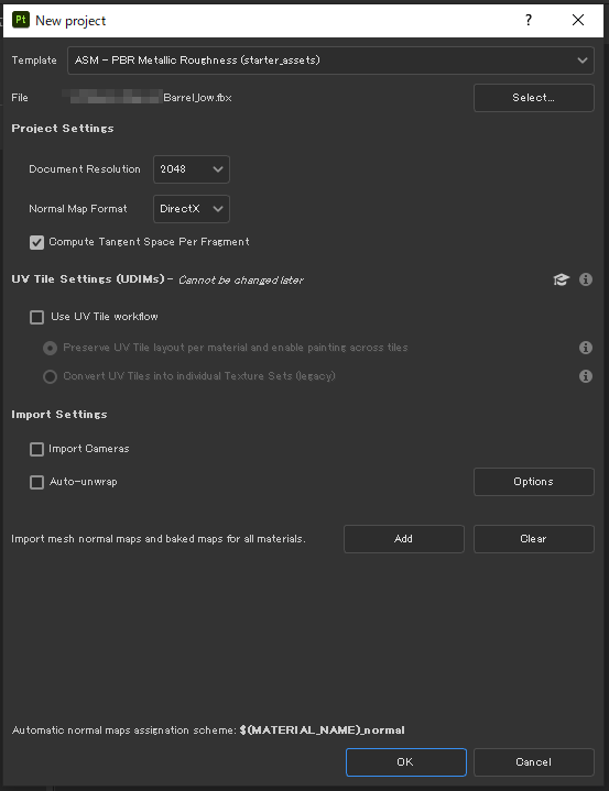 Ptを開いてFile>Newから新規プロジェクトを作成し、FileでローポリのFBXを選択します。