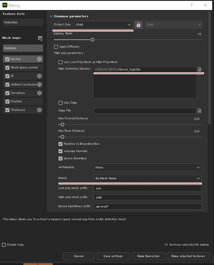 - ハイポリメッシュを指定し、以下のように設定します。Outputサイズやベイクしたいマップ等必要に応じて変更してください。■今回はOutput Sizeを変更し、MatchをBy MeshNameに変更しました