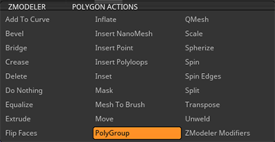 ZModelerには、ポリゴンをターゲットとして使用するなど、ポリゴンを作成および操作するための拡張ツールセットが用意されています。アクションは同じPolyGroupに属するすべてのポリゴンに影響します。