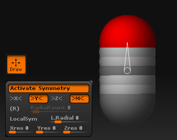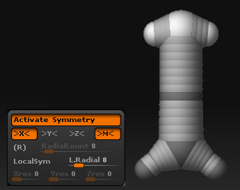 SymmetryをONにして、ボトム(底面)から次のZSphereを追加します。これがキャラクタの胴体になるでしょう。再びYをOFFにしてXをONにします。
