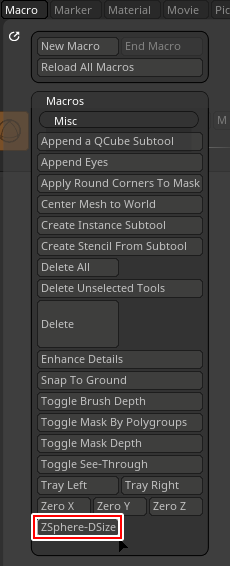 - Macro>Misc内にZSphere-Dsizeボタンが表示されます。
