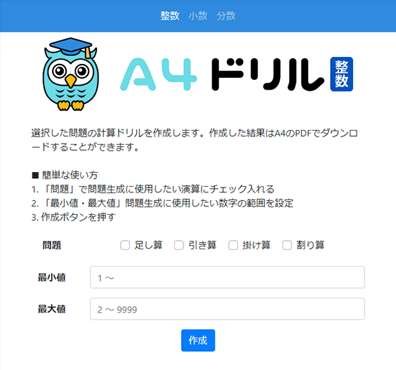 「A4で印刷できる」をコンセプトに四則演算を使った計算ドリルを自動生成するサイトです。