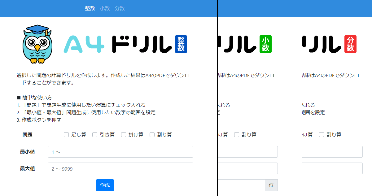 小学校で習う四則演算(+,-,×,÷)の計算問題を自動生成、印刷できるようPDF化するサイト「A4ドリル」を小数・分数に対応させました!
