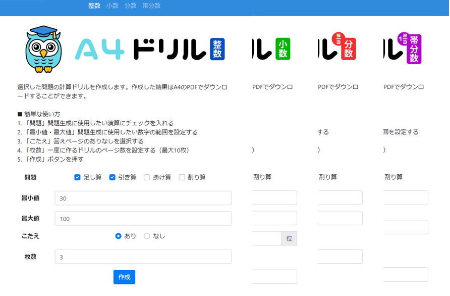 小学校で習う整数・小数・分数・帯分数を四則演算(+,-,×,÷)を使用た計算問題を自動生成、PDF化するサイト「A4ドリル」を更新しました。