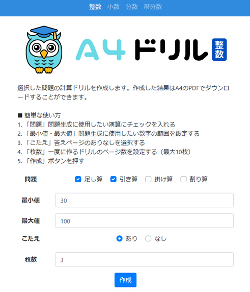 「A4で印刷できる」をコンセプトに四則演算を使った計算ドリルを自動生成するサイトです。