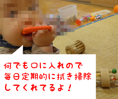 ねんねの子はマットや長座布団の上でおもちゃで遊んでます。