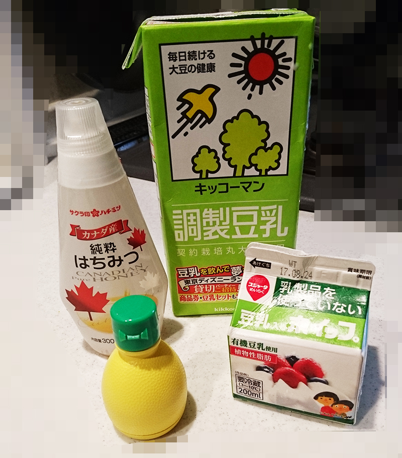 教えてもらったレシピは半分の分量なのですが、普段飲まない豆乳をすべて消費するため、豆乳基準で分量を全て倍にしてます。