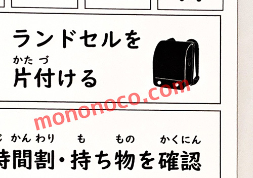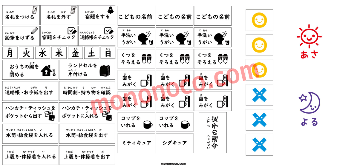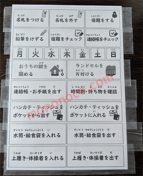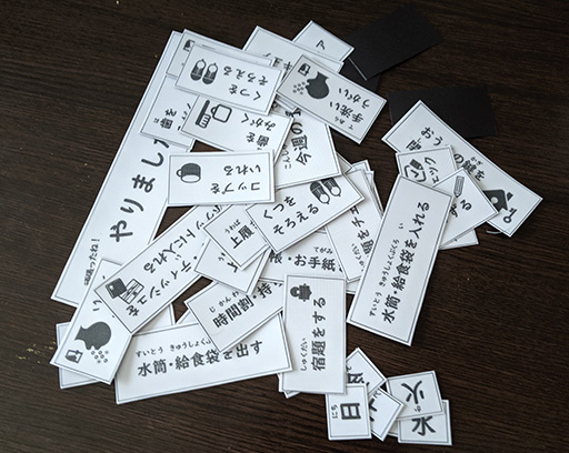 小学校に上がって子供自身にやってもらいたいことがかなり増えました。朝の持ち物準備から、帰ってから名札をとる、ランドセルを片付ける、ポケットからティッシュを出すetc。タイトルこそ22と記載していますが、細分化すれば30ぐらいは余裕で作れます。