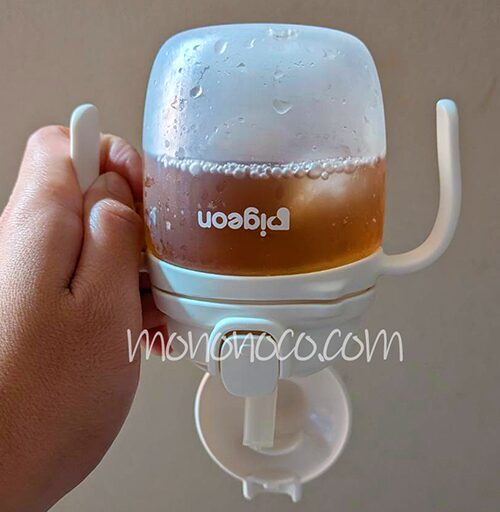 赤ちゃんに任せてしまうと哺乳瓶よろしくかぶりつくように咥えてしまうため自分で持たせると鼻がぶつかったまま飲むことに。初めは親のサポートが必須ですね。