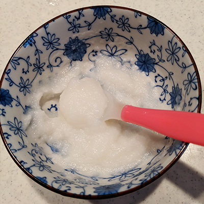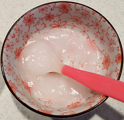 - 米がゆ1包(5g)に対し大匙3(45ml)のお湯を入れてよく混ぜる