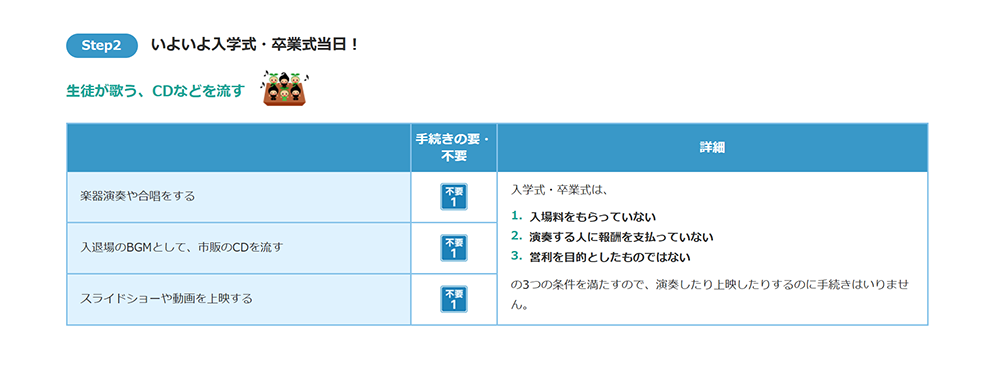 ただし卒業記念にCDやDVDを制作して生徒や保護者に配ったり、HPやSNSへ公開するような場合は手続きが必要なのでJASRACのサイトを要ご確認。