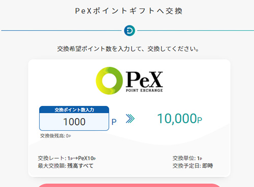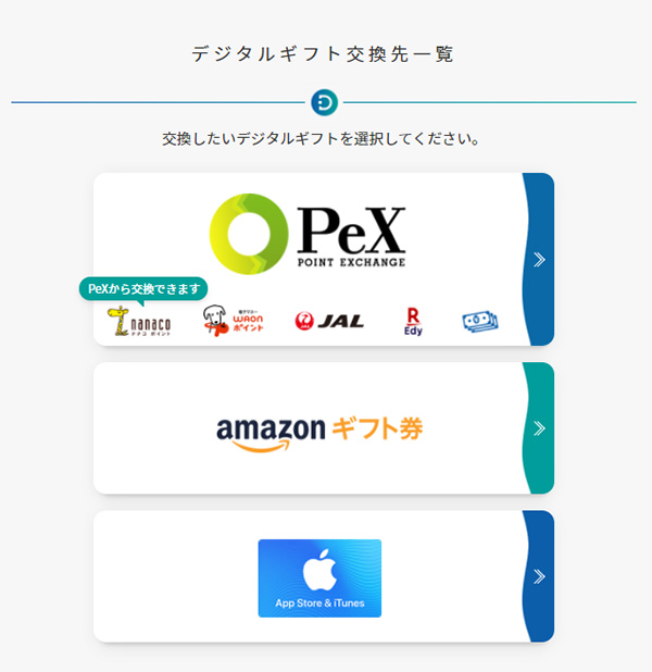 その他の電子マネーの場合、PeXというポイント交換サイトを介すことになります。現金や様々なポイントカードに交換できる反面、物によっては交換手数料がかかりますのでご注意ください。逆にちょっとお得な特別レートでの交換もあるようなのでお好きなものを選んでください