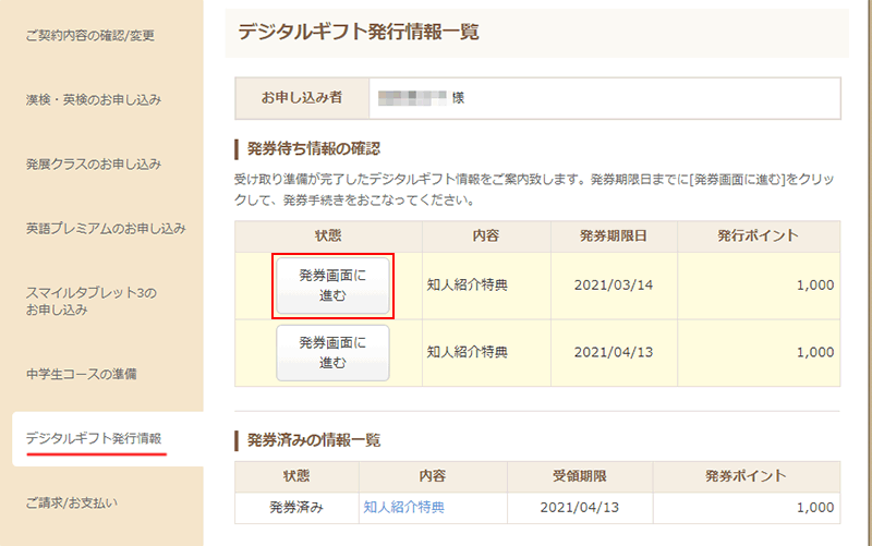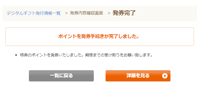 - 発券完了の詳細を見る又はデジタルギフト発行情報の発券済みの情報一覧の内容の項目から発行情報詳細にアクセスします。