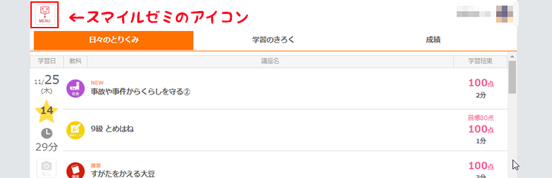 - ログインすると日々の取り組み画面に変わるので左上にあるスマイルゼミのアイコン>サービス設定にアクセスします