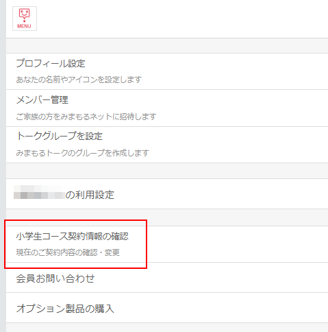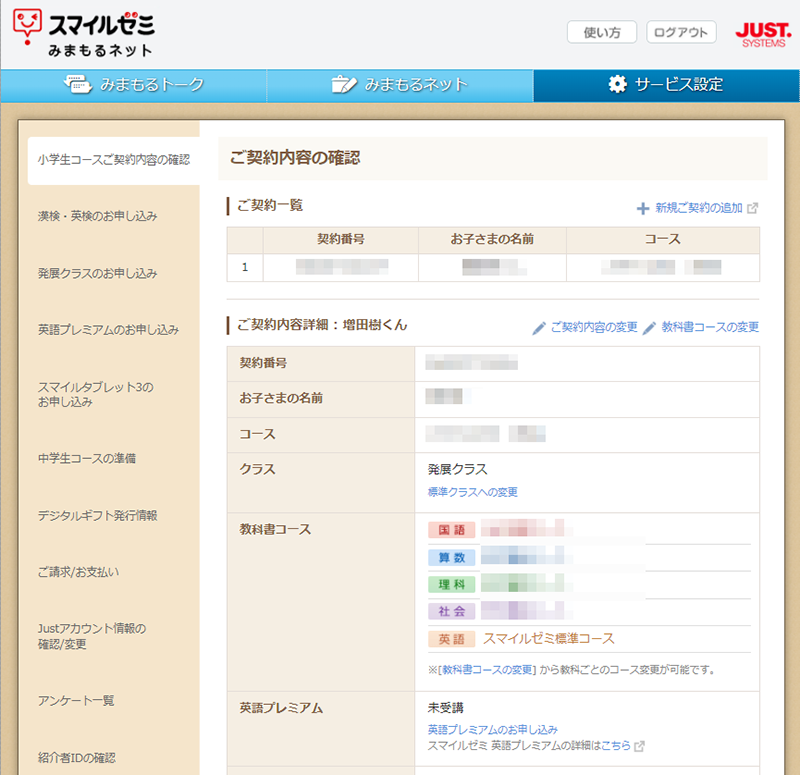 - 小学生コース契約情報の確認にアクセスすると見慣れたサービス設定画面が出てきます