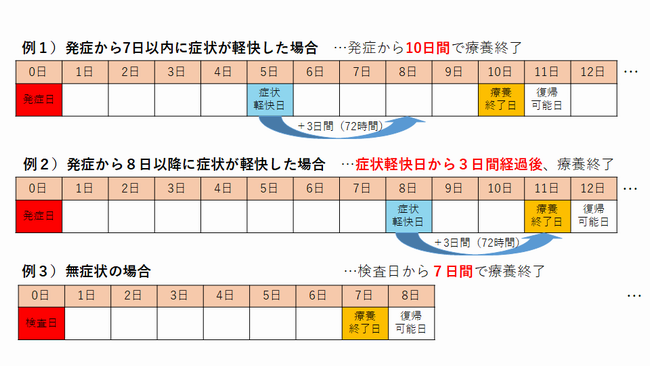 発症日(無症状の場合は検査日)から10日間が経過し、かつ、症状軽快後3日間(72時間)が経過するまでの期間。