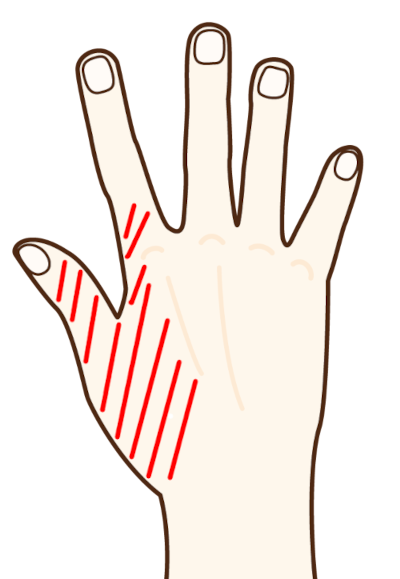 親指の付け根から人差し指の根本程度。痛みはなく、常時軽くしびれた感じ・肌の違和感がありました。